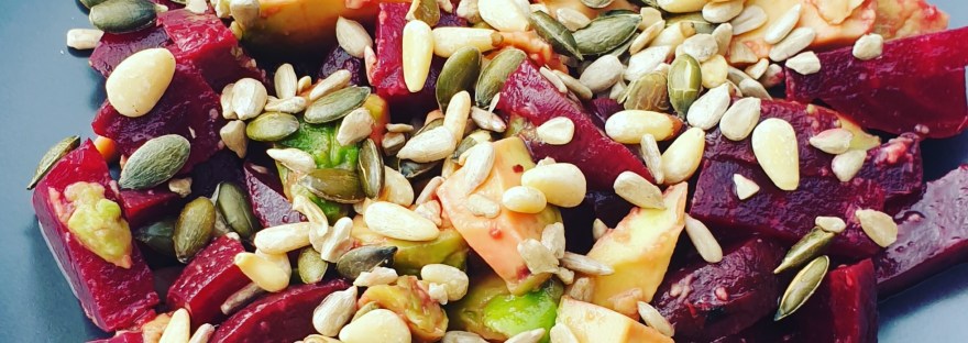Snijd de bieten en avocado in hapklare stukjes. Meng dit in een diep bord met wat olie en een snufje zout. Rooster de pitten/zaden op een niet al te hoog vuur in een pan zonder olie/vet. Let op, ze verbranden snel. Verdeel ze over de salade en geniet ervan.
